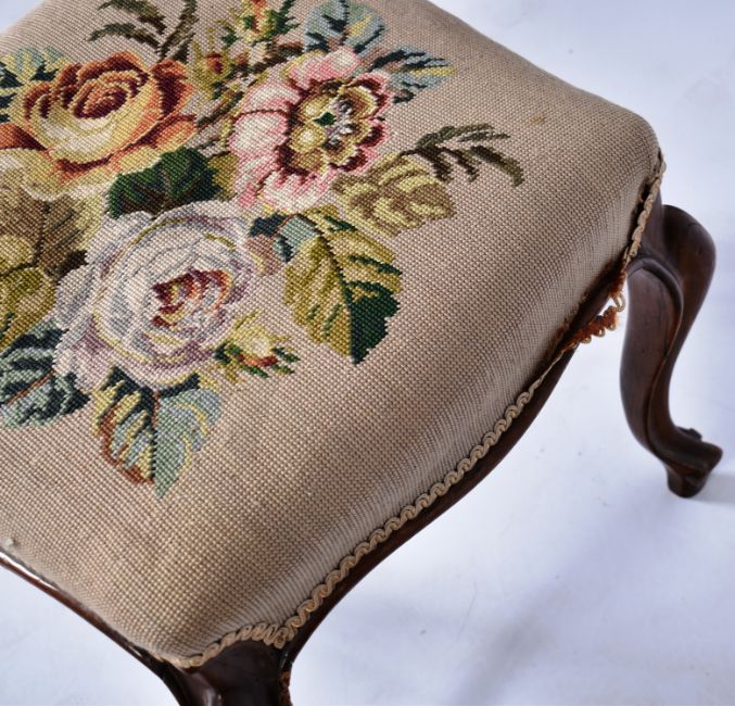 A 19th Century George III walnut stool having a floral patterned tapestry padded top raised and supported on four carved cabriole legs. No signs of damage. Measures approx; 42cm x 48cm x 44cm.