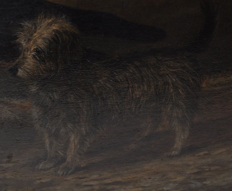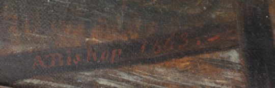 A 20th Century oil on canvas painting depicting a study of three dogs in large open field. The pointer in brown modelled standing with West Highland Terrier in front and large black Labrador to the distance. By artist A Bishop 1963. Set within an ornate gilt frame. Measures approx; 83cm x 98cm (64cm x 76cm).