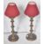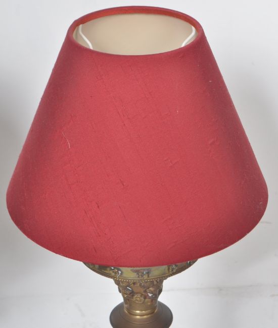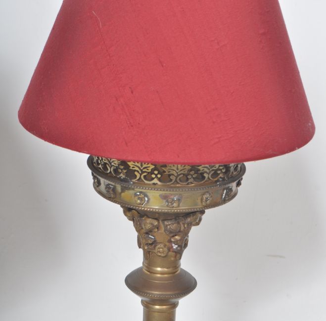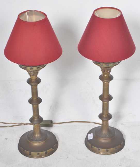 A pair of 19th Century Gothic style converted table lamp light of brass worked construction having foliate worked gallery tops with turned stems below. Each raised on circular base. Sold as untested. Measures approx; 65cm.