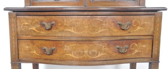 An Edwardian mahogany Sheraton revival bookcase display cabinet vitrine on stand. Comprises a twin astragal glazed top with scroll neck pediment and mirror back set with fitted shelves. The top raised on twin drawer serpentine fronted base with swing handles all raised on tapering leg with spade feet. Satinwood inlay throughout depicting scrolling acanthus leaves and floral medallions. Measures approx; 175cm x 41cm x 76cm.