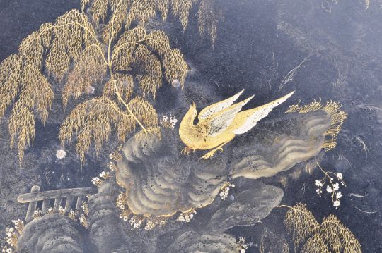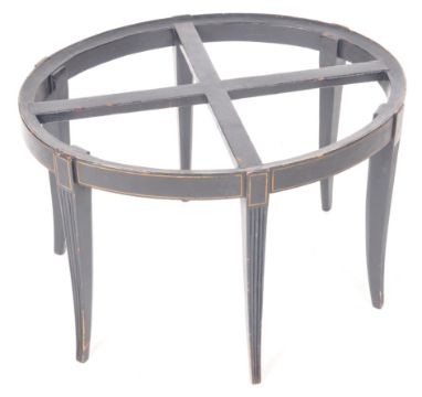 An early 19th Century Regency painted Chinoiserie Japanned toleware tray of oval form having a serpentine scalloped edge with scenes depicting birds of paradise among blossoming trees. The tray raised on a later ebonised stand with gilt borders. Measures approx; 87cm x 82cm x 68cm.