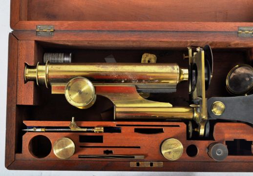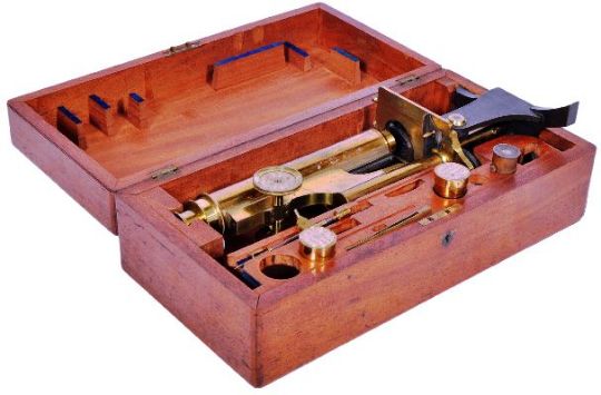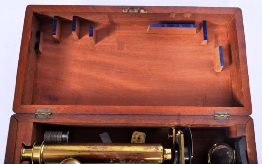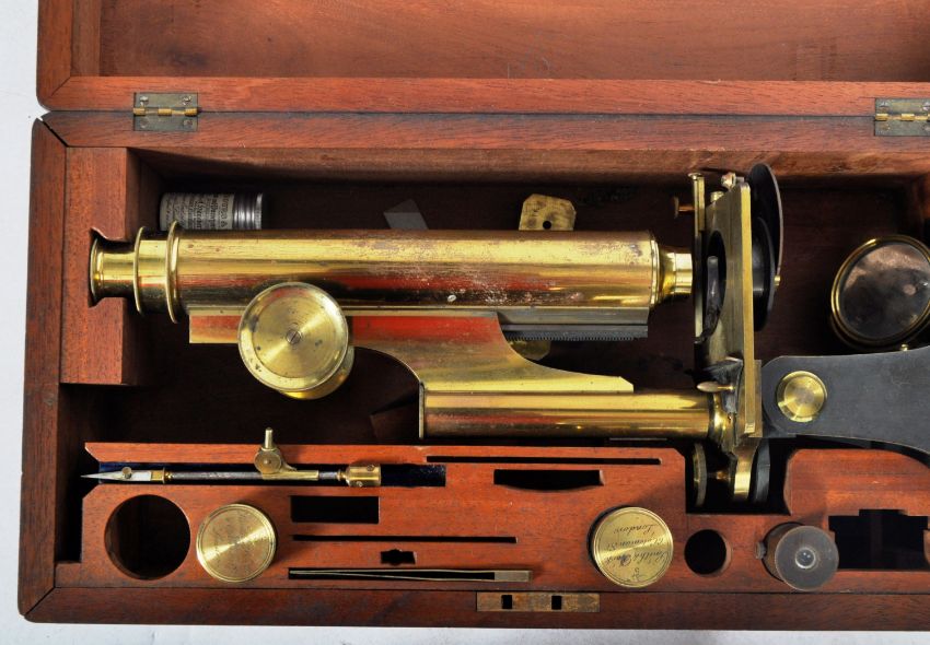 A 19th Century Victorian cased brass microscope by Smith & Beck. The microscope being set within a fitted case with some smaller instruments present. Case measures approx; 14cm x 41cm x 21cm.