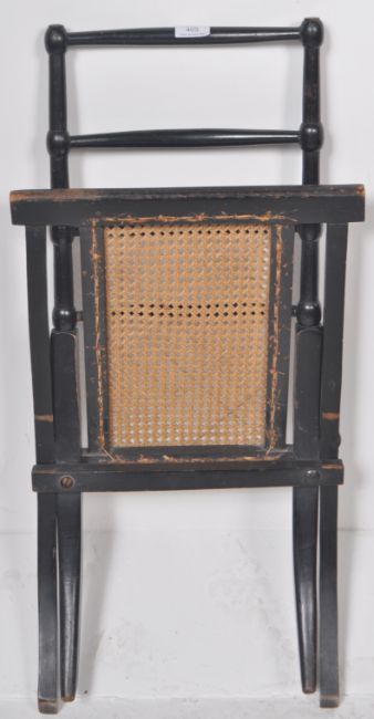 E.W.Godwin (Attributed to) - A 19th Century Victorian Aesthetic Movement ebonised folding chair / lawn chair having turned supports and ladderback backrest and cane seat. Raised on A-frame sabber supports. Measures approx; 66cm x 37cm x 60cm.