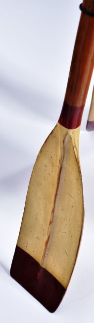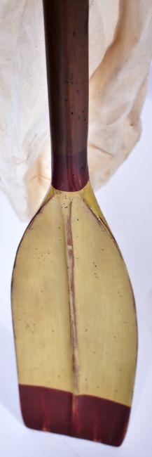 A late 20th Century coat / stick stand constructed from three rowing oars united by a turned finial atop with each oar splaying out surrounding a central canvas stick rest within. Painted oars and brass features throughout. Measures approx; 144cm tall.