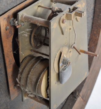 A large early 20th Century shop size advertising point of sale wall clock for Gavin Rodgers Watchmaker & Jeweller. The enamel dial being signed with Roman Numeral chapter ring and faceted hands set within a mahogany case. Exposed large fusee movement to verso. Measures approx; 71cm wide.