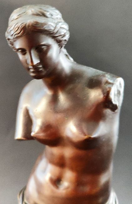 A large 19th Century Italian Grand Tour bronze figurine depicting Venus De Milo. The figure of typical form raised on bronze square base and set to a veined marble base over slate plinth. Measures approx; 37cm tall.