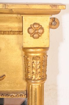 An early 19th Century Regency pier mirror frame having a bevelled edge mirror panel surrounded by gilt gesso work frame. Carved applied lyre and leaf decoration to top flanked by Corinthian columns. Measures approx; 80cm x 42cm.