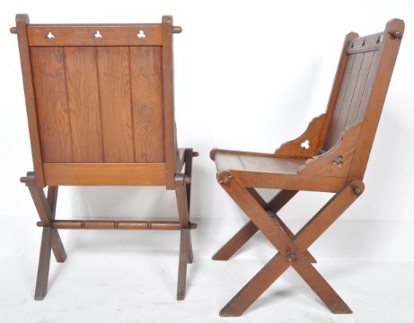 A pair of 19th Century Victorian oak Gothic ecclesiastical Glastonbury chairs in the manner of EW Pugin. The chairs with panel backs having trefoil pierced details to the top rail. Panel seats raised on 'X' frame legs united by turned stretchers. Measures approx; 90cm x 61cm x 47cm.