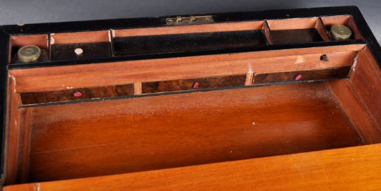 A Victorian 19th Century walnut and brass bound writing slope. The box having brass armorial to centre with brass mounts to corners with the hinged lid opening to reveal a fully appointed interior with green gilt leather slope and inkwells. Measures approx; 19cm x 50cm x 25cm.