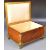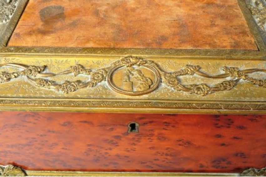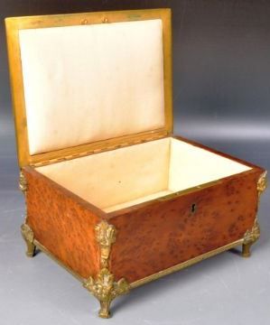 A 19th Century George III Birdseye Maple jewellery box of rectangular form having an applied brass worked frame surround to the lid with further brass embellishments below. The lid opens to reveal a pink silk lined interior with all raised on brass feet. Wear commensurate with age, overall good. Measures approx; 12cm x 33cm x 18cm.