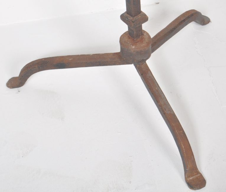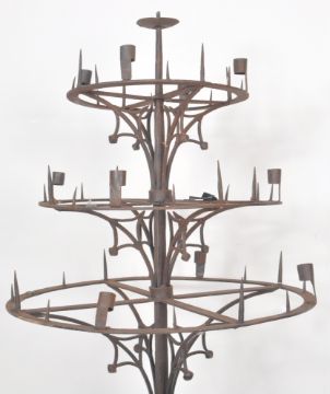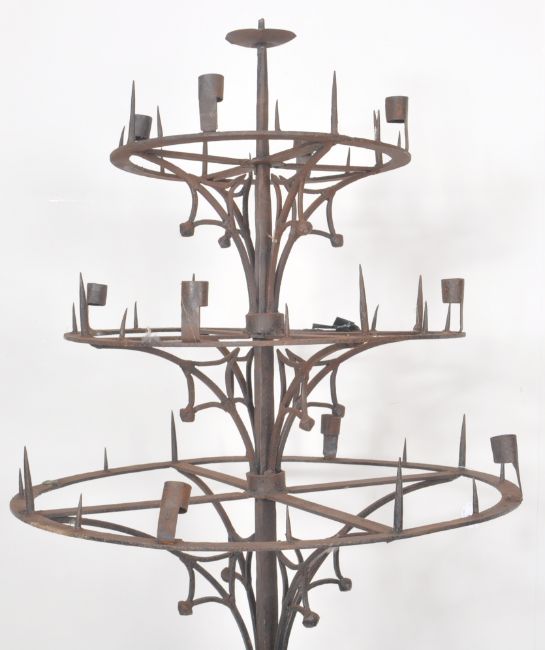 A large Cathedral size 19th Century Victorian wrought iron Gothic Ecclesiastical floor standing candelabra. Comprises a tiered central pricker multi candlestick sections set within circular bands raised on central column over shaped tripod form base. Measures approx; 218cm x 65cm x 65cm.