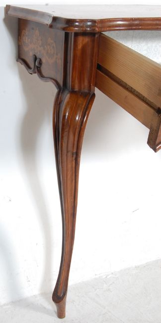 A 19th Century Dutch walnut and satin wood marquetry inlaid console hall side occasional table having a serpentine chamfered edge top with satin marquetry inlaid decoration atop. Blind fronted drawer below with further inlaid decoration raised on two thick cabriole supports. Measures approx; 79cm x 76cm x 41cm.