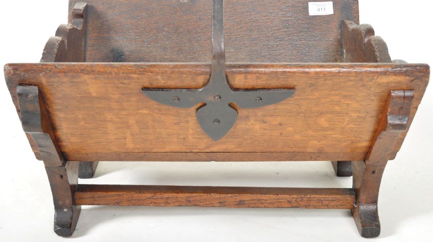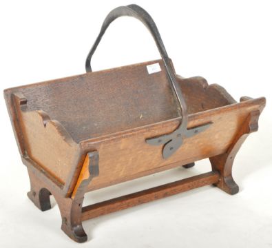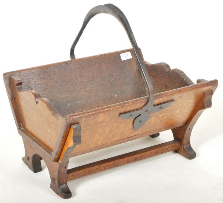 A 19th Century oak library book trug of basket form having shaped angular sides with central wrought metal handle and all raised on shaped supports. Measures approx; 45cm x 45cm x 36cm.