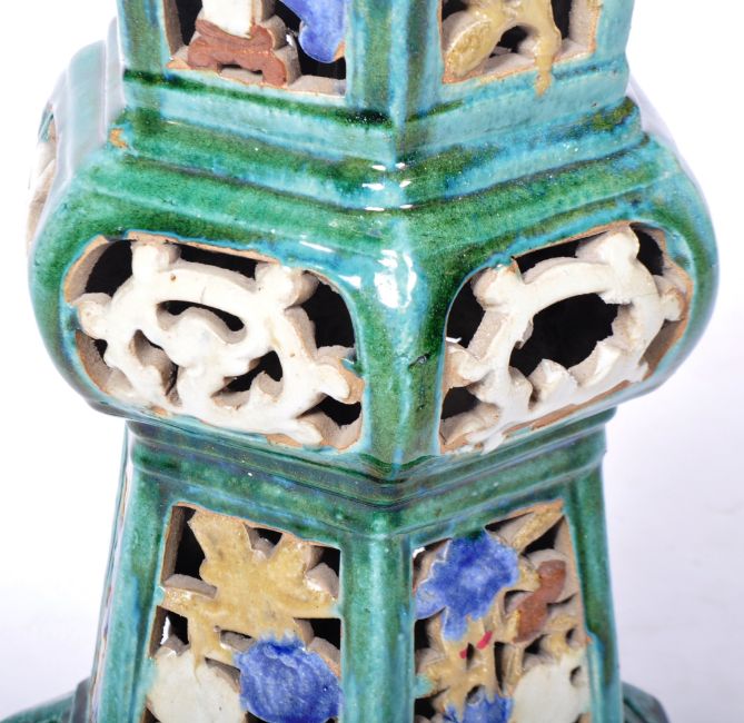 A 19th Century Chinese Sancai glazed side table / bust pedestal vase or jardiniere stand. Circular stand top with spinach green glaze ground throughout leading to a hexagonal knop, hexagonal panel sides and plinthed base. The panels pierced and decorated with scenes of flowers, birds and dogs of Fo. Measures approx; 80cm x 30cm.