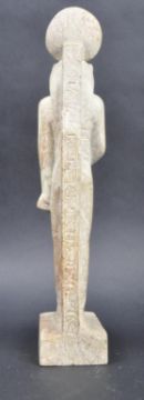 A 19th Century Egyptian Grand Tour Steatite carved stone figurine depicting the Egyptian God Sekhmet. Modelled standing with papyrus sceptre raised on plinth base. Measures approx; 23cm tall.