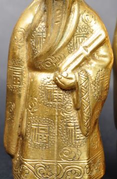 Three early 20th Century Chinese Oriental Republic period bronze / brass figurines depicting Immortals / Elders. Each modelled upright with detailing to the robes. Measures approx; 13cm tall.