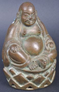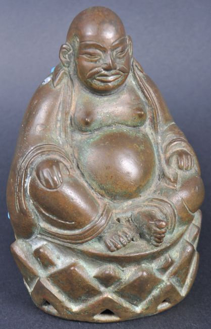 A 19th Century bronze Buddha figurine. The figure in the form of a pot bellied Buddha with hands resting on legs all raised on pedestal base. The back / reverse of the figurine having inset turquoise beads. Measures approx; 11cm.