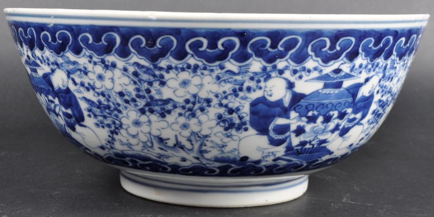 A 19th Century Chinese Kangxi mark blue & white porcelain bowl having hand painted decoration to the body with figures holding large lidded urn / vase. The central well with further decoration of figure in landscape with geometric border. Measures approx; 10cm x 23cm. Hairline crack that has been repaired and repairs to the rim throughout.