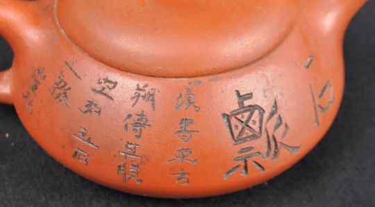 An early 20th Century Chinese Yixing pottery teapot. Red clay body with incised decoration, small loop to the top of lid and looped handle. Incised marks to base. Measures approx; 5cm x 11cm. Good condition.