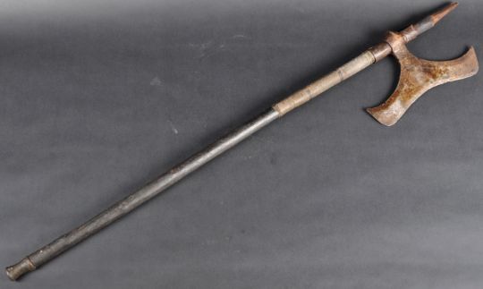 A 19th Century Indo Persian Islamic Ottoman Bulova or Tongi steel-bladed fighting or war axe from Chota Nagpur in India. Blackened wood shaft with wire detailing, brass mounts and shaped steel axe head blade. Measures approx 87cm long. Blade measures 23cm.