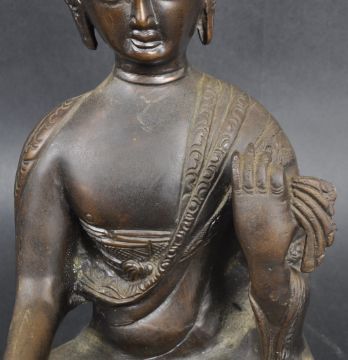 A 19th Century Chinese bronze figurine of Buddha. The figure modelled in the lotus position with legs crossed and ornate headdress with robe over shoulder. detailed facial expression and hands with one hand resting on leg and other raised holding flower / feather. Measures approx; 22cm x 15cm.