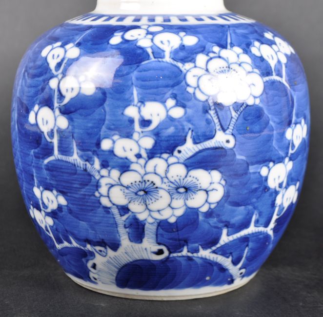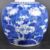 A 19th Century Chinese blue and white porcelain ginger jar in the Prunus pattern. Hand painted blue and white decoration depicting blossoming prunus branches on blue ground. Concentric blue circles to underside. Measures approx; 13cm tall.