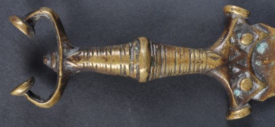 A late 19th Century Buddhist Tibetan prayer wheel, ceremonial brass sacrificial dagger and a Thai relief decorated figural ceremonial spoon. Largest measures approx; 24cm.