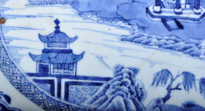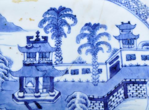 An 18th Century Chinese Qianlong period export blue & white platter tray plate of canted rectangular form. The plate with blue & white decoration depicting landscape scene. The borders decorated with repeating botanical decoration. Measures approx; 25cm x 33cm. Hairline cracks throughout with one larger one through the centre. Wear to rim.
