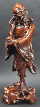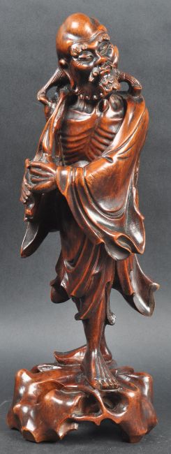 A large 19th Century Chinese hand carved figurine depicting an emaciated elder immortal figurine / Lohan Buddha. The figure modelled with bare chest and exposed ribe, robe draped and raised on carved socle base. Measures approx; 33cm tall.