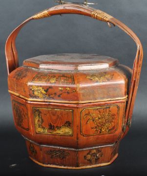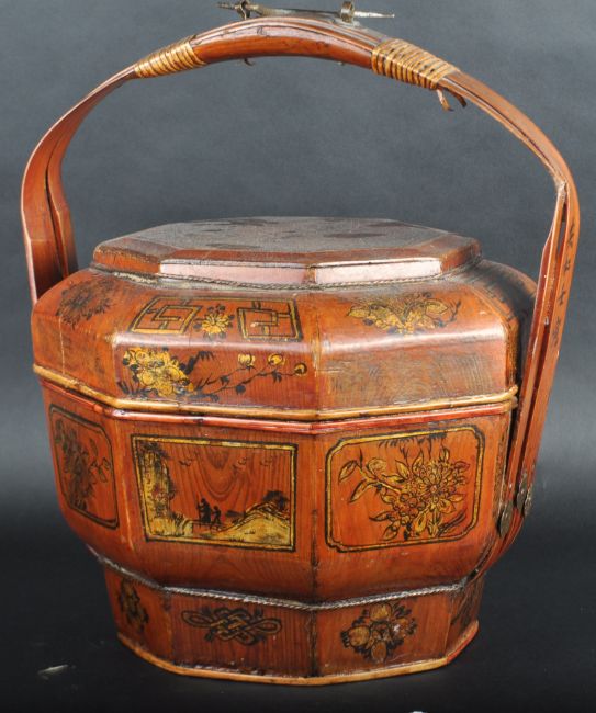 An early 20th Century Chinese Qing Dynasty wooden rice container food box having a shaped bentwood handle with octagonal form box with lacquer finished with gilt decoration depicting landscape scenes and botanical details. Measures approx; 34cm x 28cm x 28cm.