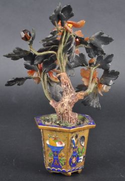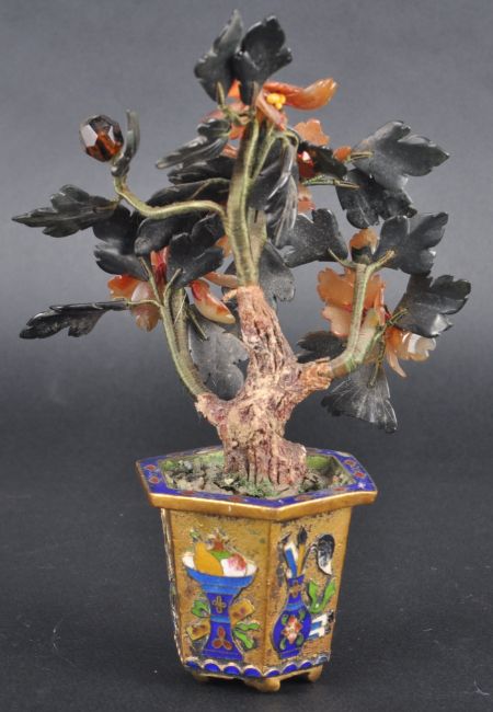 A pair of early 20th Century Chinese Cloisonne agate bonsai trees. Both having facet and shaped cut agate stone pieces and being set within gilded cloisonné enamel planters. Measures approx; 15cm tall.