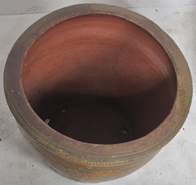 A large pair of 19th Century Chinese Qing Dynasty 100 year Egg Pots / jardinière planters. Hand painted decoration depicting dragons chasing the flaming pearl. Measures approx 37cm x 50cm. Originally used to store and cure eggs as a delicacy.