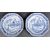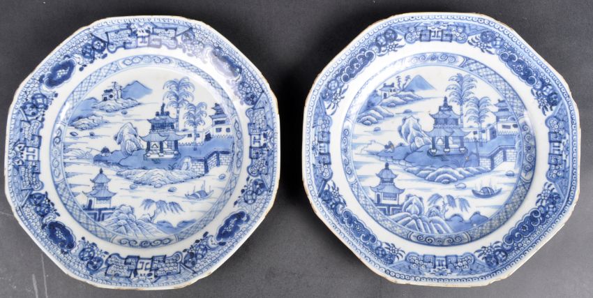 A pair of 18th Century Chinese porcelain blue and white plates having hand painted scenes depicting pagodas in rocky outcrops and fisherman within repeating decorative borders. Measures approx; 23cm wide. Minor chips and small hairline to one.