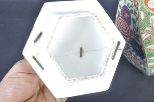 A 19th Century unusual Chinese porcelain vase and cover of large size. The body of twisted spiral form decorated in panels using Wucai colours. Depicts repeating botanical details with geometric bands. The cover further decorated with pointed finial top. Restoration to rim and riveted repair to lid. Measures approx; 39cm tall.