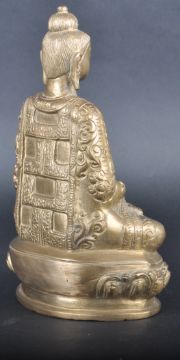 A large early 20th Century Chinese bronze figurine of Buddha. The figure modelled in the Lotus position wearing scroll decorated robe with hands touching and legs crossed raised on lotus pedestal base. Measures approx; 20cm tall.