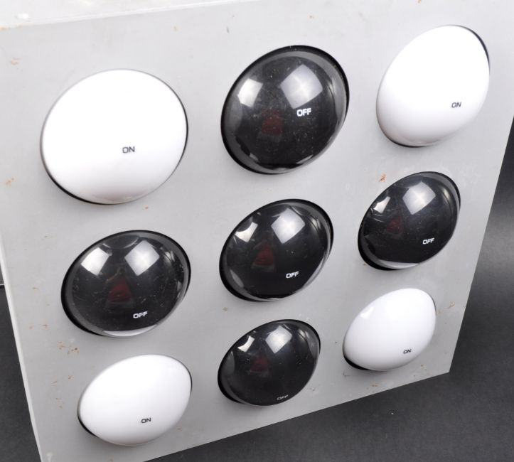 Paul Talman - Model Fifty Fifty - A retro mid 20th Century 1960s Swedish space age wall mountable lamp light. The lamp having a aluminum case that holds nine rotating plastic balls, each ball has 'ON' printed to the white side and 'OFF' printed to the black side. Label present. Sold as untested. Measures approx; 40cm x 40cm.