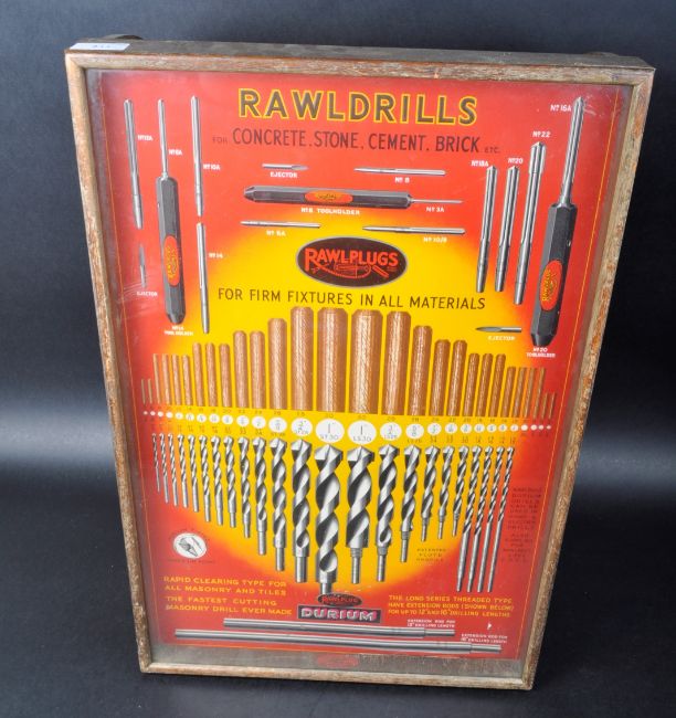Rawldrills - Rawlplugs - A retro vintage 20th Century advertising shop display case having a full length glazed front with cardboard advertising card for drill parts. Open case back with the case marked for Rawl Plugs. Measures approx; 62cm x 41cm x 30cm.