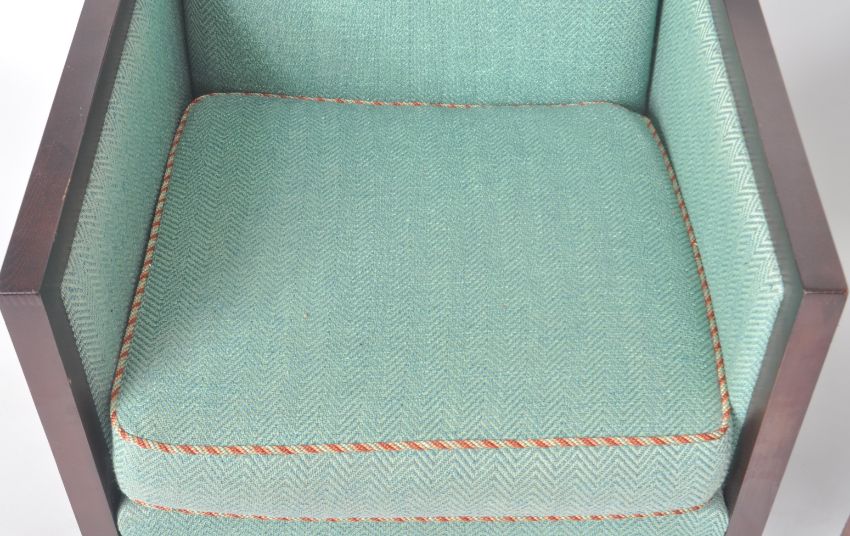 Steed Upholstery - A matching pair of Contemporary wingback fireside / lobby armchairs of cube like form with tall backrests with L-shaped panel sides with each upholstered in a turquoise fabric with show wood frames. Each raised on straight leg supports. Each arm chair measures approx; 108cm x 65cm x 75cm.