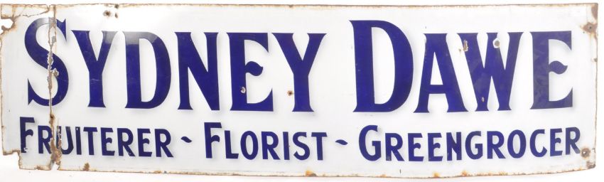 Sydney Dawe - A vintage 20th Century advertising point of sale shop display enamel porcelain sign for Sydney Dawe 'Fruitere - Florist - Greengrocer'. Cobalt blue lettering on white ground. Measures approx; 46cm x 170cm.