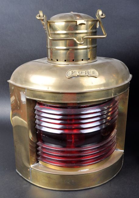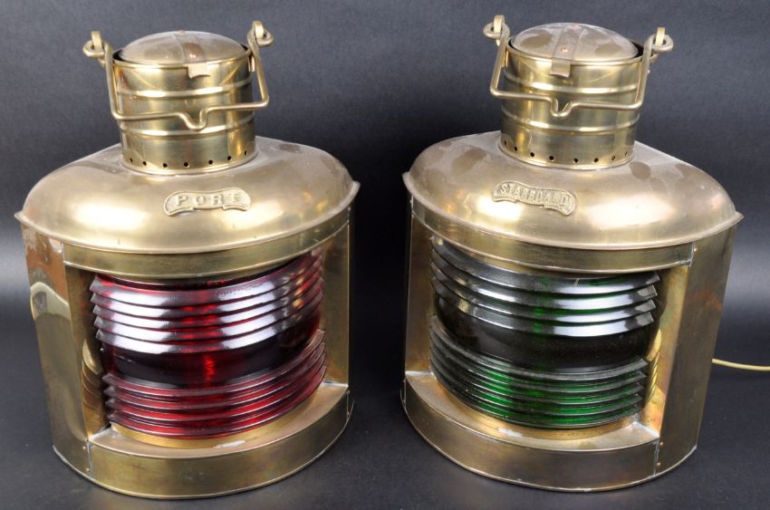 A pair of vintage 20th Century nautical / maritime ships navigation lamp lights of brass construction with each having ribbed coloured glass plates, one red and the other green. Each complete with notation plaques one for Port and the other Starboard. Sold as untested, overall good condition. Each measures approx; 47cm x 36cm.