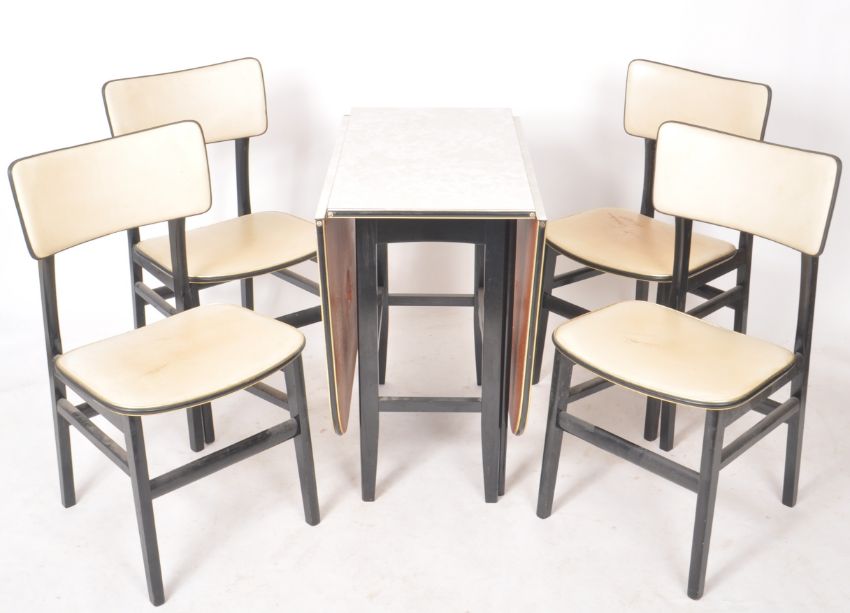 Umberto Mascagni - A retro mid Century Italian formica drop leaf dining table and four chairs. The table having a gateleg action with ebonised supports. The chairs having faux leather padded curved backrests and seatrests and ebonised supports. Table measures approx when open 76cm x 78cm x 152cm.