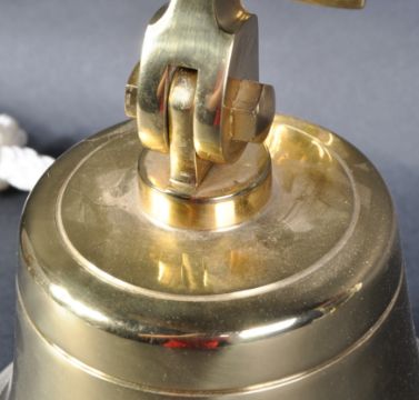 A 20th Century solid brass nautical / maritime ships bell of typical form with adjustable mounting bracket. Inscribed A.M.L. Comes with CoC from the Nauticalia Marine Traditionalist's. Good condition throughout. Measures approx; 23cm x 22cm diameter.