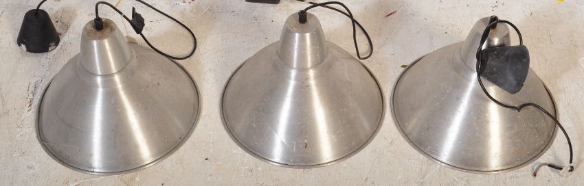 A matching set of three 20th Century industrial / factory aluminum hanging pendant lights of bell form. Each measures approx; 30cm x 36cm.