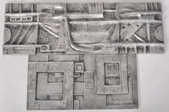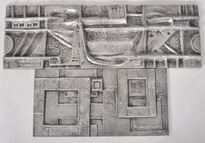 Two retro 20th Century 1970s formed fiberglass abstract / brutalist art panels with each having geometric patterns with a steel painted finish. Unsigned. Tallest measures approx; 102cm x 33cm.