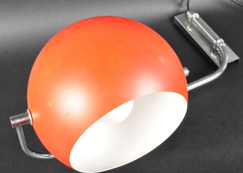 GEPO Amsterdam (believed) - A contemporary wall / ceiling mountable eyeball lamp light having a red finished shade supported by polished steel supports. Unmarked. Sold as untested. Measures approx; 60cm.