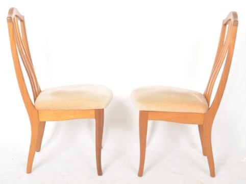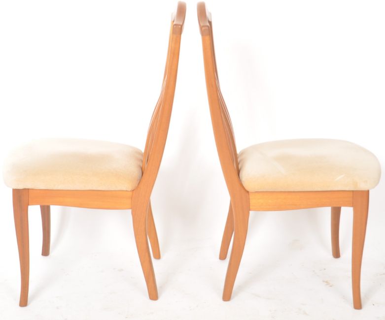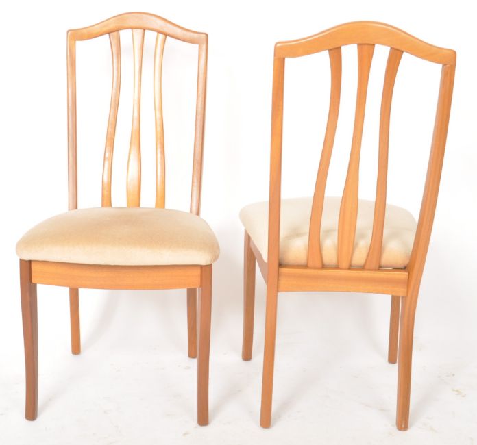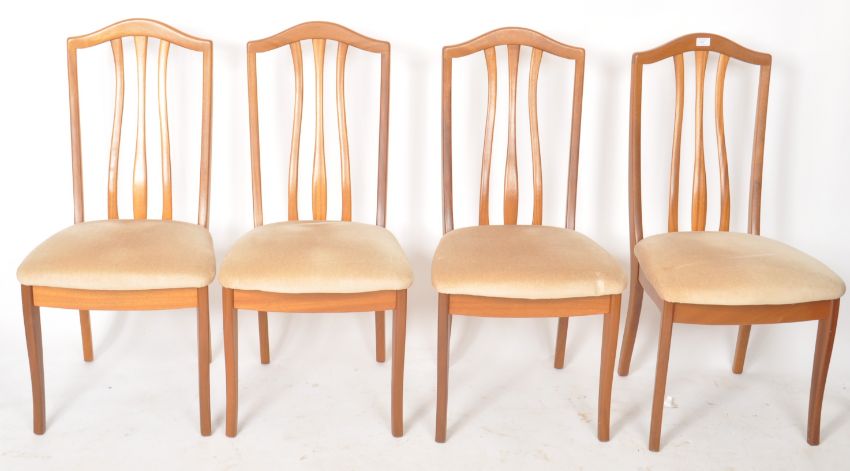 A. H. Mcintosh & Co - A matching set of four late 20th Century retro teak dining chairs / side chairs with each having a slatted curved backrest and padded seat restes. Each raised on a thick sabbre supports. Each measures approx; 100cm x 50cm x 47cm.