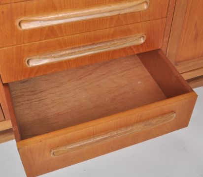 Victor. B. Wilkins - G-plan - Fresco range - A retro vintage mid 20th Century 1970s teak wood sideboard credenza by G Plan comprising a central bank of four drawers flanked by twin door cupboards revealing shelved interiors. The handles being lipped to each door and drawer and the unit raised on tapering legs with stretchers. Measures approx; 81cm x 213cm x 46cm.