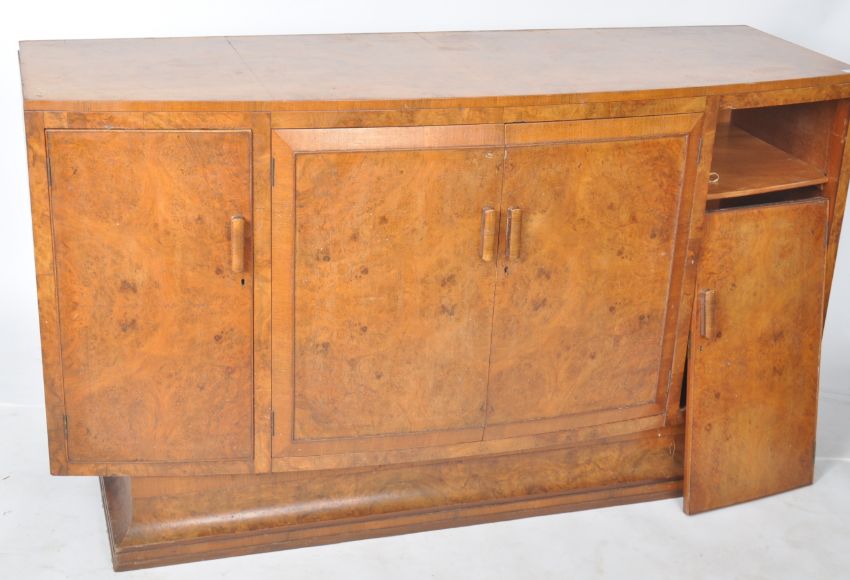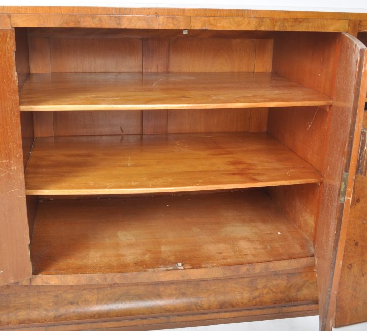 A vintage 20th Century Art Deco walnut bow fronted sideboard credenza having a central double door cupboard flanked by single door cupboards to each side all housing shelved interiors. Raised on a decorative slip plinth base. Measures approx; 94cm x 167cm x 60cm.