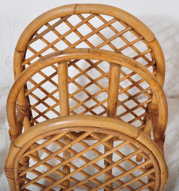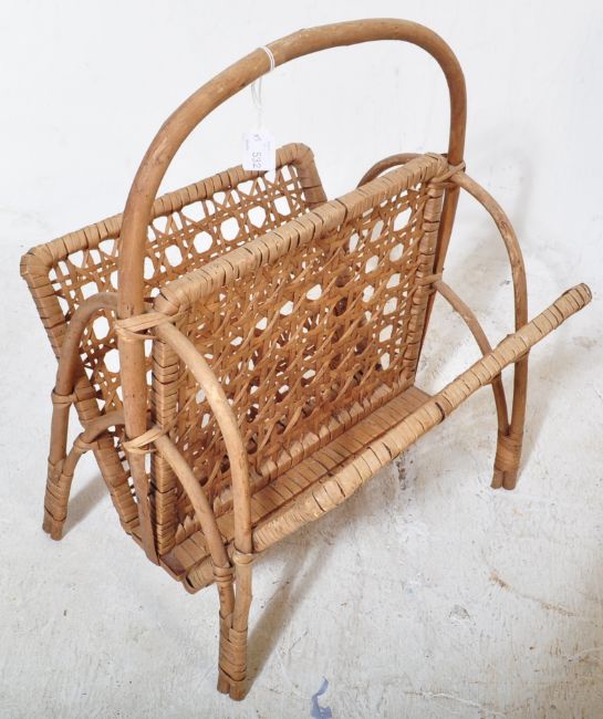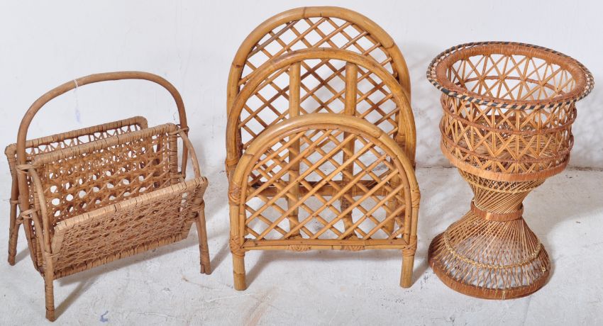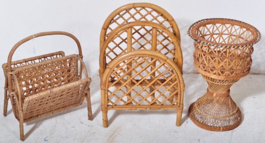 A selection of retro 20th Century bamboo and rattan magazine racks each different in style with one of drum form. One in the manner of Franco Albini with dual section. Largest measures approx; 56cm x 41cm.