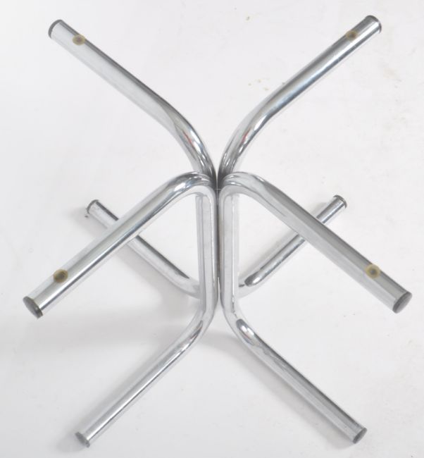 A retro 20th Century 1980s chrome and glass topped coffee table / low table. Square clear glass top raised on an X-framed splayed tubular chrome base. Measures approx; 42cm x 74cm x 74cm.